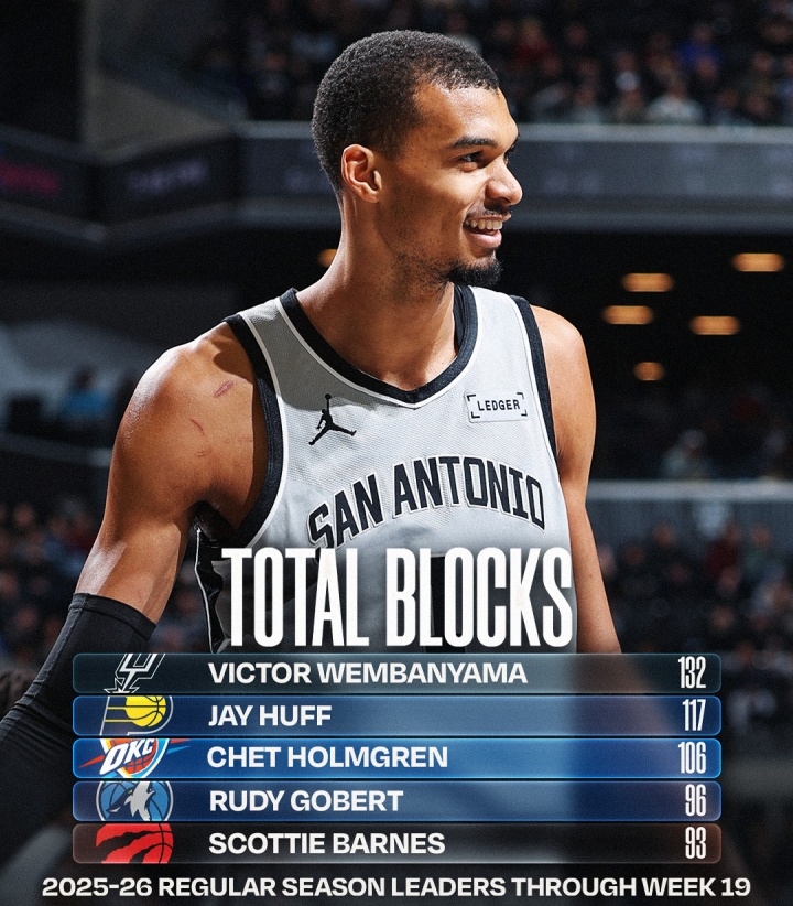 开云体育-NBA官方晒盖帽榜:文班总盖帽一骑绝尘 场均2.9帽无人能及