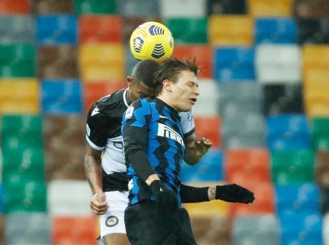 孔蒂的球队在弗留利球场,迎头撞上了一座坚实的石头城。你肯定不想在晚上11点的街道上,遇到一脸恶汉相的“乌鸡”卫将努伊丁克、贝康和迪马约,但即使是面目俊朗的博尼法齐出战,也不影响戈蒂的球队在防守端的硬度。乌迪内斯三天内两平蓝黑,几乎完全冻结了两支火力冠绝联赛的球队。“石头城”百密中的一疏,出现在上半场第23分钟:贝康后场出球失误,乌龙助攻劳塔罗,但蓝黑10号的单刀球,被好友兼国家队队友穆索神奇封出。