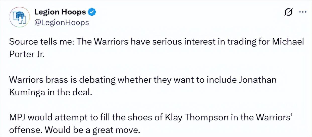 北京时间1月12日,美媒Legion Hoops报道称,金州勇士队对交易得到小迈克尔-波特抱有浓厚兴趣。勇士管理层正就是否将库明加纳入交易筹码展开讨论。小波特将力争填补克莱在勇士进攻体系中的空缺。这笔交易若是达成,将会是一步妙棋。