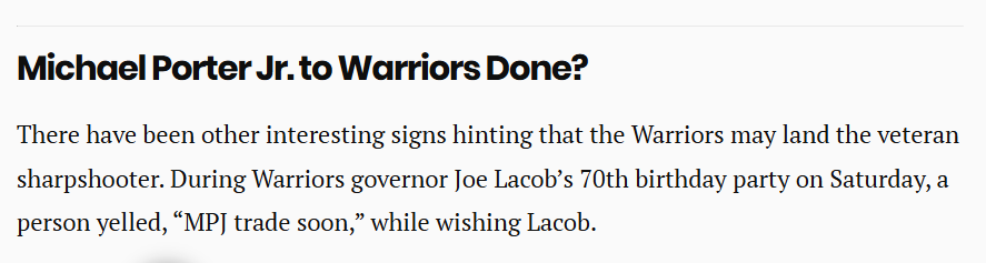 还有其他有趣的迹象暗示,勇士可能已经接近得到小波特。在勇士老板乔-拉科布的70岁生日派对上,有人在向拉科布送上祝福时大喊:“很快就会有小波特的交易了。”